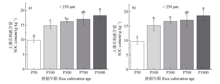 注:图中误差线为标准差;不同小写字母表示不同植稻年限间差异显著(P < 0.05)。下同。 Note:Error bars indicate standard deviation. Different lowercase letters indicate a significant difference between ages(P < 0.05). The same below. 图 1 不同粒径团聚体有机碳含量随植稻年限的变化 Fig. 1 Changes in SOC content of different size aggregates with rice cultivation ages |