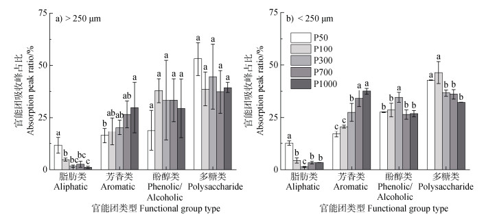 红外光谱数据导入OMNIC软件进行分析,根据吸收峰可将有机质分为四类(表 1)。用脂肪族碳与芳香族碳的比例来表征脂族化程度。低脂族化程度表明土壤中芳香族环状结构较为丰富,其分子结构较为复杂,这通常会增强土壤有机质的稳定性[16]。