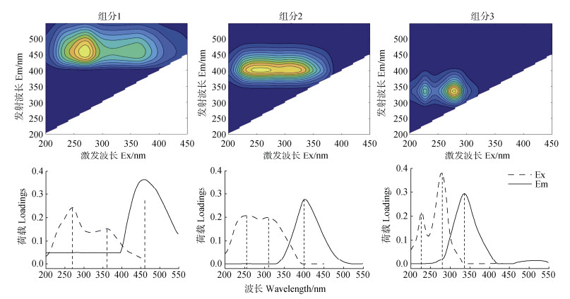 图 4 通过PARAFAC模型识别出的三种DOM组分的激发-发射矩阵(EEMs)位置和荷载 Fig. 4 Excitation-emission matrix(EEMs)locations and loadings for the three DOM components identified by the PARAFAC model |