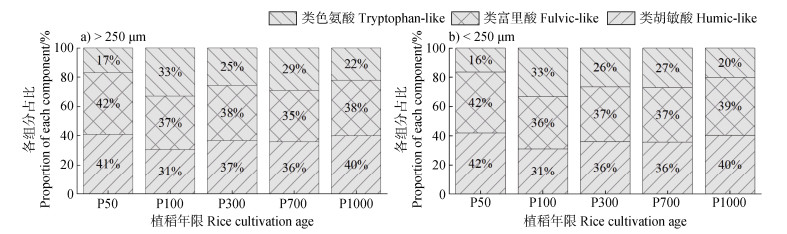 在不同粒径团聚体中,类色氨酸DOM相对含量在植稻50~100年间从16%~17%上升至33%,植稻100年后又逐渐下降至20%~22%;类富里酸和类胡敏酸DOM在植稻50~100年间分别从41%~42%降至36%~37%和31%,但在植稻100年后,类富里酸DOM相对含量处于动态平衡状态,而类胡敏酸在植稻100~300年显著增加至36%~37%后保持稳定(图 5)。