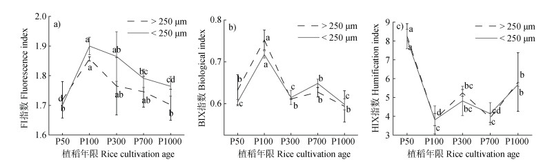 图 6 不同粒径团聚体荧光光谱指数随植稻年限的变化 Fig. 6 Changes in fluorescence spectral index in different size aggregates with rice cultivation ages |