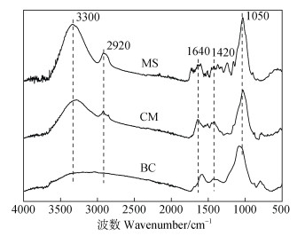 图 1 生物炭(BC)、牛粪(CM)和玉米秸秆(MS)的傅里叶变换红外光谱 Fig. 1 FTIR spectrum of biochar(BC), cattle manure(CM)and maize straw(MS) |