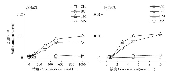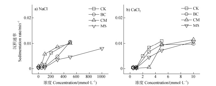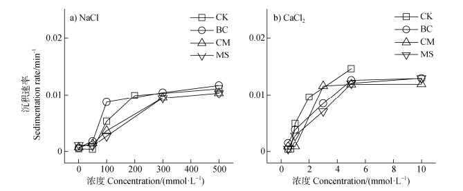 不同有机物料对中度盐碱土胶体沉积速率的影响如图 10所示。NaCl和CaCl2体系中,添加不同有机物料后土壤胶体的沉积速率表现为:CM > MS > BC > CK。BC处理后的土壤胶体的kdep与CK相似,基本不随盐浓度的变化而变化,胶体稳定性极高,而MS和CM处理的土壤胶体kdep则随离子强度的增加而增加,胶体稳定性减弱,土壤胶体絮凝沉积。