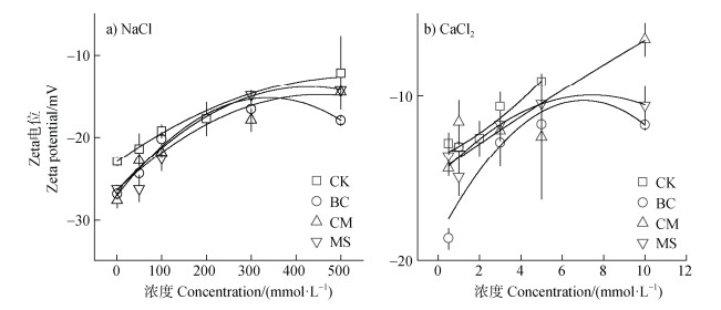 不同有机物料的添加提高了非盐碱土胶体的Zeta电位绝对值(图 2)。在NaCl体系中,CK处理胶体的Zeta电位变化范围是-22.93~-12.16 mV,添加不同有机物料后,土壤胶体Zeta电位变化范围是–27.67~–14.27 mV。CaCl2体系中,CK处理土壤胶体Zeta电位变化范围是–13.10~–9.10 mV,添加BC处理,土壤胶体Zeta电位明显降低,变化范围为–18.67~–11.70 mV。