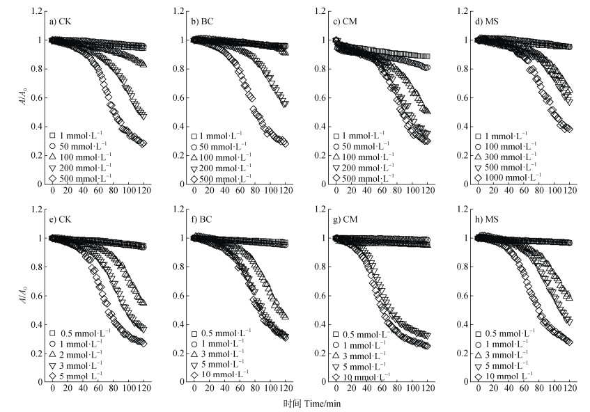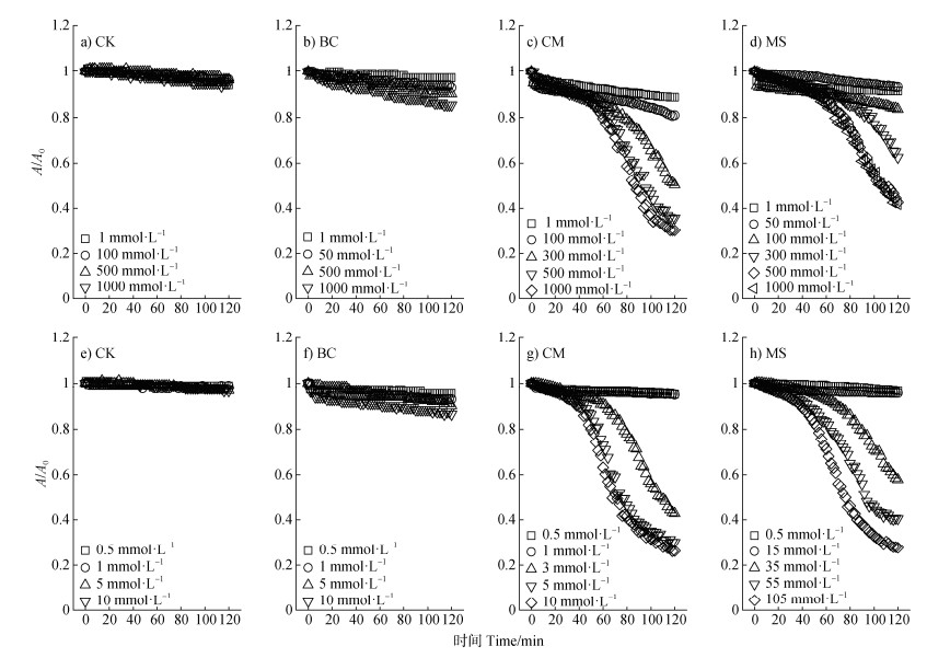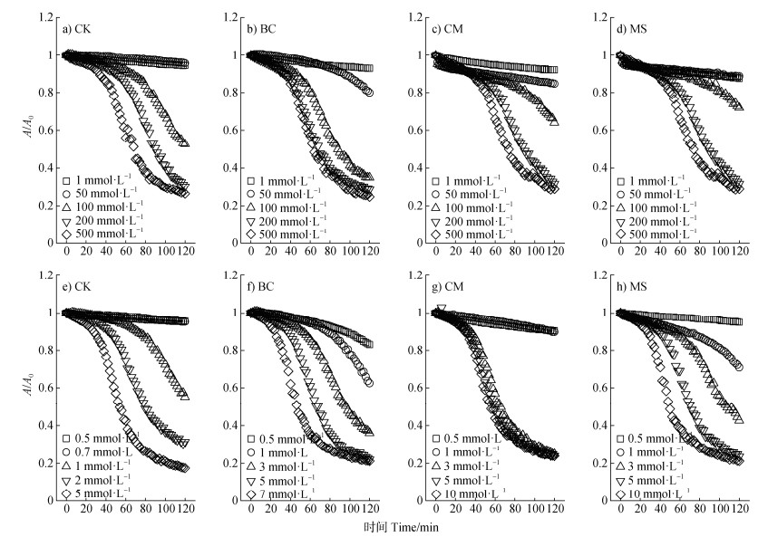注:图a-d背景电解质为NaCl溶液,图e-h为CaCl2溶液。Note:Background electrolyte:NaCl solution(figure a-d),CaCl2 solution(figure e-h). 图 6 不同有机物料对轻度盐碱土胶体相对吸光度的影响 Fig. 6 Effect of different organic materials on the relative absorbance of mild saline-alkali soil colloid |