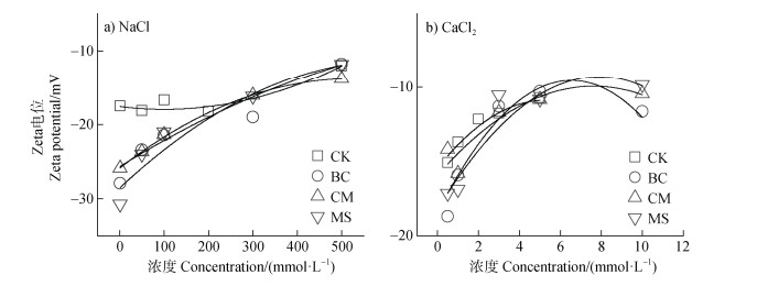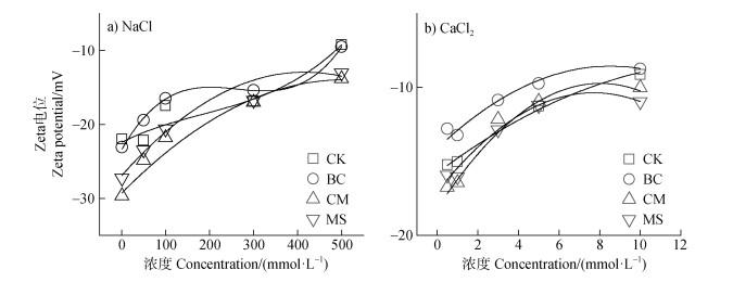 有机物料提高轻度盐碱土胶体Zeta电位的绝对值,这种现象在低浓度盐溶液下更加明显(图 5)。NaCl体系中,CK处理土壤胶体Zeta电位变化较小(–18.27~–12.03 mV),添加不同有机物料后,土壤胶体Zeta电位变化范围变大(–30.70~–11.80 mV),且对电解质浓度变化响应更加敏感。NaCl溶液浓度由1 mmol·L–1改变至500 mmol·L–1时,各处理Zeta电位的变化值为:MS(18.90 mV) > BC(16.17 mV) > CM(12.06 mV) > CK(6.24 mV)。CaCl2体系中,添加不同有机物料对土壤胶体Zeta电位影响不大。