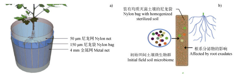 注:a)根箱由一个高度为136 mm、直径为110 mm的三层圆柱体组成。内层(根室)由50 μm尼龙网制成,可防止根进入中间层,外层由4 mm金属网制成,以支撑根茎盒。b)中间采样层由18个单独的尼龙网袋(150 μm尼龙网,高度136 mm,宽度18~21 mm,厚度1~2 mm)组成,其中包含均质灭菌的田间土壤。因此,中间层尼龙网袋中的土壤与植物根系和根系分泌物紧密接触,并被用作根际细菌群落的代理。该图根据Wei等[22]的成果重新绘制,对原图的布局、配色和字体进行了统一修改。 Note: a)The rhizobox consisted of a three-layer cylinder with a height of 136 mm and a diameter of 110 mm. The inner layer(root compartment)is made of a 50 μm nylon mesh net, which prevents roots from entering the middle layer, and the outer layer is made of a 4 mm metal mesh to support the rhizobox. b)The middle sampling layer consisted of 18 individual nylon mesh bags(150 μm nylon mesh; height, 136 mm; width, 18 to 21 mm; thickness, 1 to 2 mm)containing homogenized and sterilized field soil. The soil in the nylon mesh bags of the middle layer was thus in close contact with plant roots and root exudates and was used as a proxy of the rhizosphere bacterial community. This figure was redrawn based on the results of Wei et al. [22], and made uniform modifications to the layout, color scheme, and font of the original figure. 图 2 非破坏性收集根际土壤的根箱系统示意图 Fig. 2 Schematic diagram of the rhizobox system for non-destructive collection of rhizosphere soil |