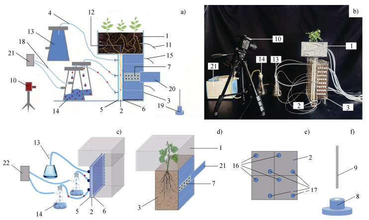 如图 3c所示,根系分泌物采样装置18包括真空泵21(GM-0,津腾,天津市津腾实验设备有限公司)、储液瓶13、采样瓶14和连通管4,真空泵21和采样瓶14管路连接,储液瓶13和淋洗液入口16采用连通管4连接,采样瓶14和淋洗液出口17采用连通管4连接,真空泵21由电磁开关和程序自动控制采样时长及间隔,减少了对植物根系的扰动,同时可进行连续取样;根系生长区室2的外壁为透明有机玻璃,根系生长区室2外设置有实时拍摄设备10;土壤区室3外侧设置有土壤取样装置19,如图 3f所示,土壤取样装置19包括取样管9和辅助手柄8,取样管9和辅助手柄8插拔连接。