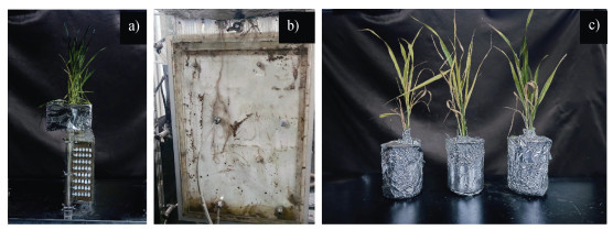 供试小麦种子(品种:周麦26)经3%(w/w)过氧化氢溶液表面灭菌后,使用去离子水彻底冲洗,于珍珠岩基质中进行催芽处理。选择长势均一的健壮幼苗,分别移栽至植物生长区室及对照组盆栽中。已移植小麦幼苗的装置如图 4a所示。幼苗移栽后,自然光下培养,除地上部分外,所有地下装置组件均使用锡箔纸进行避光处理。