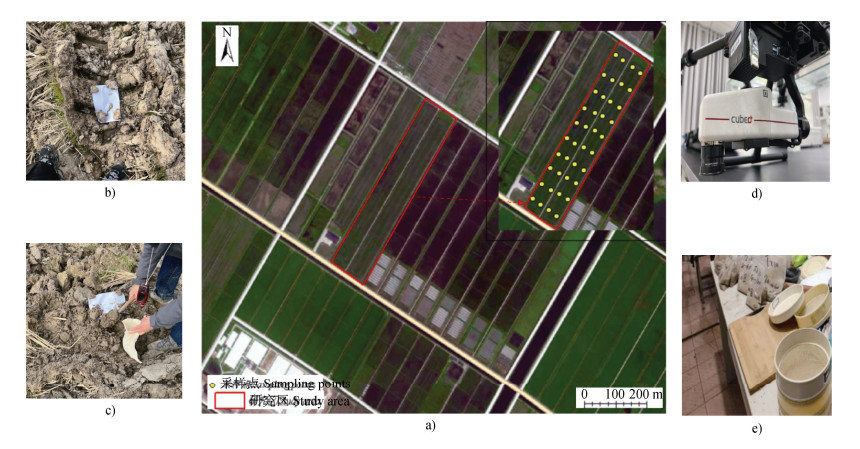 图 1 研究区采样点空间分布和实验流程(a:样点分布图,b:标志点布设,c:土壤采样,d:Cubert S185成像光谱仪,e:样本研磨筛选) Fig. 1 Spatial distribution of sampling sites and experimental procedures in the study area(a)sampling location map; (b)marker placement; (c)soil sampling; (d)Cuber S185 imaging spectrometer; (e)sample grinding and sieving |