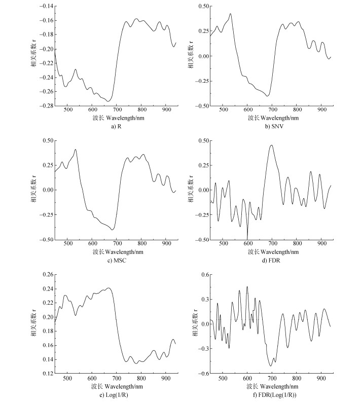 图 2展示了土壤光谱和土壤盐分含量之间的相关系数趋势。图中的原始光谱经过SG平滑处理,其他光谱变换均基于SG平滑后的原始光谱进行。结果表明,原始光谱和Log(1/R)变换,与其他光谱变换相比,与土壤盐分的相关性较弱(图 2a,图 2e);相比之下,SNV、MSC、FDR和FDR(Log(1/R))变换后光谱与SSC的相关系数均有所提高;SNV与MSC变换后的光谱与SSC的最大相关系数分别达到0.42和0.4(图 2b,图 2c)。FDR与FDR(Log(1/R))变换后的光谱与SSC的最大相关系数达到0.5左右(图 2d,图 2f)。除Log(1/R)、FDR变换之外,其他变换在大约670~800 nm的波长范围内(即红光和红边间)相关系数呈波动上升趋势,并在该范围内的特定波长位置达到极大值。