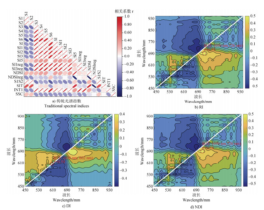 图 4b、图 4c、图 4d展示了全波段优化光谱指数的相关性热力图(等势图)。通过遍历125个波段的组合计算,筛选出相关系数最大的敏感波段组合。结果表明,RI(比值光谱指数)的最敏感波段组合为690、726 nm,相关系数为0.55;DI(差值光谱指数)的最敏感波段组合为606、602 nm,相关系数为0.5;NDI(归一化光谱指数)的最敏感波段组合为690、726 nm,相关系数为0.54。