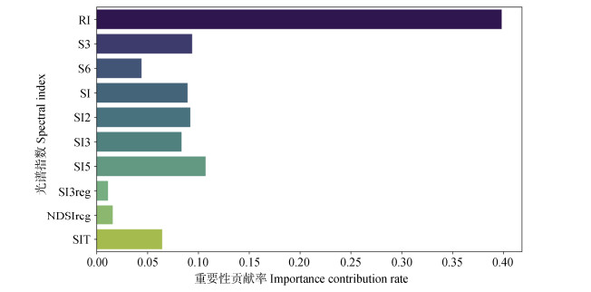 为防止出现过拟合现象,本研究引入数据增强和特征选择。其中,特征选择采用递归特征消除(RFE)方法,其通过反复拟合模型并评估特征的重要性[40],逐步剔除最不重要的特征。在本研究中,选择中位数作为阈值,以确定特征的重要性排序,直到达到指定的特征数量或理想的模型性能水平。本研究初始光谱指数共有21个,经RFE特征选择后,最终保留10个关键光谱指数,特征选择结果如图 5所示,其中RI、S3、SI5等重要性贡献率较高。由表 6可知,基于特征选择的建模结果中,XGBoost模型在训练集和测试集的R2均大于等于0.8,展现出最高的精度,优于其他三种模型的结果。