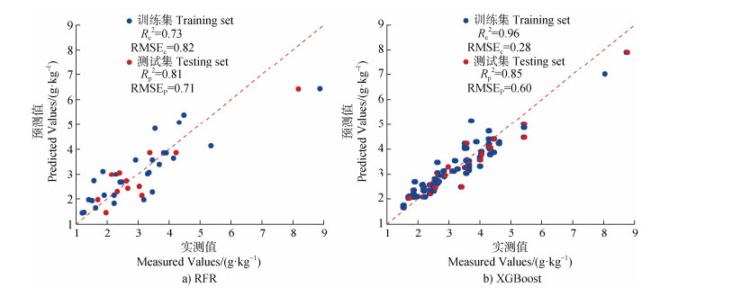 根据表 5和表 6中的建模结果,选择最优SSC预测模型,并绘制散点图(图 6)。从图 6中可以观察到两个预测模型的预测值和真实值之间存在不同程度的偏差。当SSC含量高于8 g·kg–1时,基于特征选择的XGBoost模型比基于原始光谱RFR模型更接近实测值。总体而言,基于特征选择的XGBoost模型预测值和真实值更接近1︰1线,表明其预测精度较高。