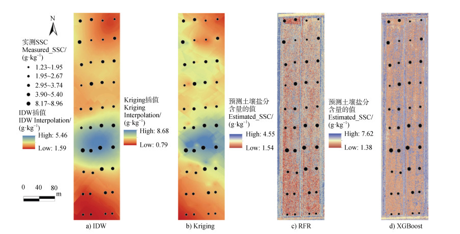 4 结论本研究以慈溪滨海地区的土壤盐分含量为研究对象,利用无人机成像光谱数据,建立基于全波段数据和光谱指数的预测模型,并通过最优模型对研究区土壤盐分含量进行了空间制图和分析,得到以下结论:全波段模型中经SG平滑的原始光谱RFR模型表现出最高的预测精度;在光谱指数模型中,基于特征选择的XGBoost模型表现出最优的预测性能,适用于本研究区的土壤盐分反演。反演结果图表明,该地区土壤盐分空间分布呈现出中低含量广泛分布、高值零散分布的特征;XGBoost模型较为适用于全面、准确地预测土壤盐分的整体分布,而基于原始光谱的RFR模型更适合于较低盐分及其平均值的预测。因此,本研究创新地结合全波段优化光谱指数和传统光谱指数构建的预测模型,可以为无人机成像光谱技术在田间尺度SSC快速监测提供了范例。
