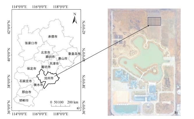 1 材料与方法 1.1 研究区概况沧州市位于河北省滨海区域,地处华北平原中东部,东临渤海,南接山东,北靠京津(37°29′-38°57′N,115°42′-117°50′E)。该地区地势低平,总体呈现微倾向海的特点,地貌类型以冲积平原为主。属于温带季风气候,四季分明,年均气温约为12.5℃,年均降水量为581mm,但降水时空分布不均,夏季多集中性强降水,冬季相对干旱。当地主要粮食作物有小麦(Triticum aestivum L.)和玉米(Zea mays L.),还种植谷子(Setaria italica)、豆类(Leguminosae)等作物。盐碱地特色农业有黄骅苜蓿(Medicago sativa L.)和碱地梨(Pyrus spp)等特色农产品。试验地点为中国科学院南大港滨海生态试验站(图 1b),试验站位于河北省沧州市渤海新区南大港产业园区内(图 1a),该区属于典型的滨海盐碱地带,土壤含盐量较高,质地多为黏壤土或壤土,结构松散,透水性和透气性较差,表面常有盐霜现象,尤其在干旱季节更为显著。