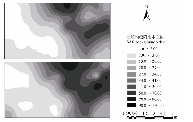 SAR空间分布呈显著区域分异特征。研究区西部、西南部上、下两层土壤SAR值较低,受盐分影响较轻;东部、东北部、东南部地区SAR较高,盐渍化程度较重。下层SAR空间分布较上层增大,受Na+毒害作用较强(图 2)。