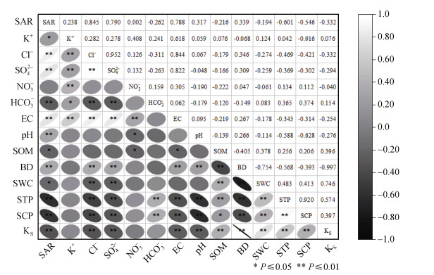 图 3 土壤SAR与土壤盐分和理化性质的相关性 Fig. 3 Correlation graph of soil SAR with soil salinity and physicochemical properties |