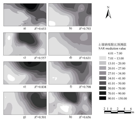 训练集下层回归分析的显著性P<0.001。测试集R2为0.838(表 3),拟合效果较好。训练集土壤SAR的回归方程如下: