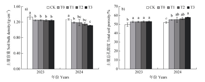 2 结果 2.1 盐碱障碍粮田土壤容重和总孔隙度对羊粪配施木醋液的响应在2023年和2024年,羊粪配施木醋液各处理的土壤容重较CK显著降低(图 1a),土壤总孔隙度较CK显著提高(图 1b),其中,在2024年,不同木醋液用量间表现为T3处理的土壤容重较T0显著降低12.46%,T3处理土壤孔隙度较T0显著提高11.52%,但T1~T3间土壤容重和孔隙度无显著差异。上述两年结果表明,羊粪配施270~810 kg·hm–2木醋液对土壤容重和土壤通透性均有一定程度正向调控。