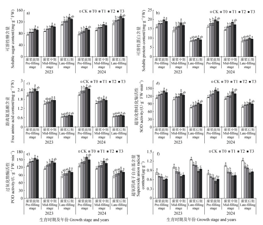 旗叶生理指标的测定:冬小麦灌浆前、中、后期(2023年5月6日、5月22日、6月3日,2024年4月29日、5月16日、5月29日)于各小区随机采集10~15片小麦旗叶,擦净叶片用锡纸包裹,迅速置于液氮中,–80 ℃冷藏,用于后续测定生理指标。分别用蒽酮比色法、考马斯亮蓝G-250蛋白染色法、茚三酮显色法测定可溶性糖、可溶性蛋白、游离氨基酸含量。超氧化物歧化酶(SOD)活性、过氧化物酶(POD)活性和超氧阴离子自由基(