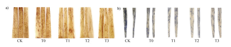 图 3 各处理下二氨基联苯胺(a)和氮蓝四唑(b)的组织化学染色 Fig. 3 Histochemical staining of diaminobenzidine(DAB, a)and nitrotetrazolium blue chloride(NBT, b)under each treatment |