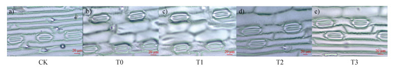 气孔承担着与外界进行气体交换的关键任务,逆境时,植物会改变气孔开度来适应环境,而施加外源物质可调节气孔特征。Zhang等[25]发现,干旱条件下,褪黑素可显著提高小麦气孔保卫细胞长度、气孔孔径长度;张欢玲等[26]发现,在高温强光胁迫下,小麦叶片受到刺激关闭气孔,而外源水杨酸能够诱导气孔张开。本研究结果与上述研究相似,T2的气孔长度和宽度较CK、T0显著提高,T2的气孔周长和气孔面积较T0、T1显著提高,T1、T2、T3的气孔开度较CK显著提高(表 2)。该结论表明羊粪配施适宜木醋液用量可显著提高盐碱障碍粮田冬小麦叶片气孔与外界环境的交换能力。