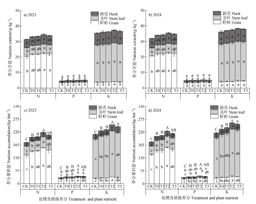 2023年,T2、T3籽粒氮含量分别较CK显著提高9.82%、7.57%,T2颖壳氮含量较CK显著提高了13.73%,而其他处理各器官氮、磷、钾含量无显著差异(图 5a)。与CK相比,除T0、T1的籽粒钾累积量和颖壳氮、磷、钾累积量无显著差异外,其他处理各器官氮、磷、钾累积量均较CK显著提高(图 5c)。2024年,T2籽粒、茎叶和颖壳的氮含量分别较CK显著提高了9.43%、16.62%、10.86%(图 5b);T2处理籽粒氮、磷、钾累积量均较CK、T0显著提高,T3籽粒氮、磷、钾累积量较CK显著提高了17.91%、16.37%、24.01%;CK、T0处理茎叶氮、磷、钾累积量及T1茎叶磷钾累积量均较T2处理显著降低;CK处理颖壳氮、磷、钾累积量及T0颖壳氮累积量均较T2显著降低(图 5d)。两个生长季,羊粪配施木醋液处理下冬小麦氮、磷、钾总累积量(颖壳、茎叶和籽粒养分累积量的总和)均较CK显著提高,T2处理下冬小麦氮、磷、钾总累积量均较T0、T1显著提高,而T2和T3处理下冬小麦各器官养分含量、累积量以及总累积量差异较小,未达显著性水平。以上结果表明,羊粪与木醋液配施能提高冬小麦对营养物质的吸收和积累能力,其中羊粪配施中量木醋液(T2)优于其他处理。
