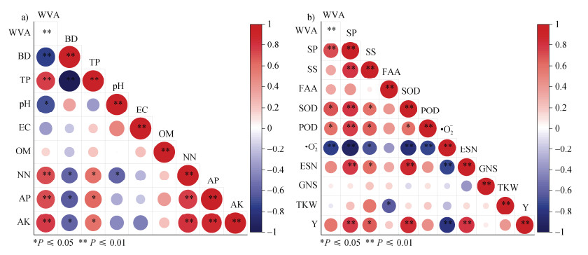 木醋液用量与土壤总孔隙度、土壤速效氮磷钾含量呈极显著正相关,与土壤容重呈极显著负相关,与pH呈显著负相关(图 6a);木醋液用量与可溶性蛋白含量呈极显著正相关,与SOD、POD呈显著正相关,与超氧阴离子自由基呈极显著负相关(图 6b)。上述相关分析表明,该试验条件下增施的木醋液,通过正向调控土壤硝态氮、有效磷、速效钾含量及冬小麦SOD、POD活性,进而降低超氧阴离子自由基的产生,为增加冬小麦抗盐能力提供了物质基础。