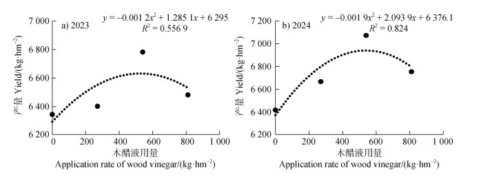 图 7 木醋液用量与冬小麦产量关系 Fig. 7 Relationship between application rate of wood vinegar and yield of winter wheat |