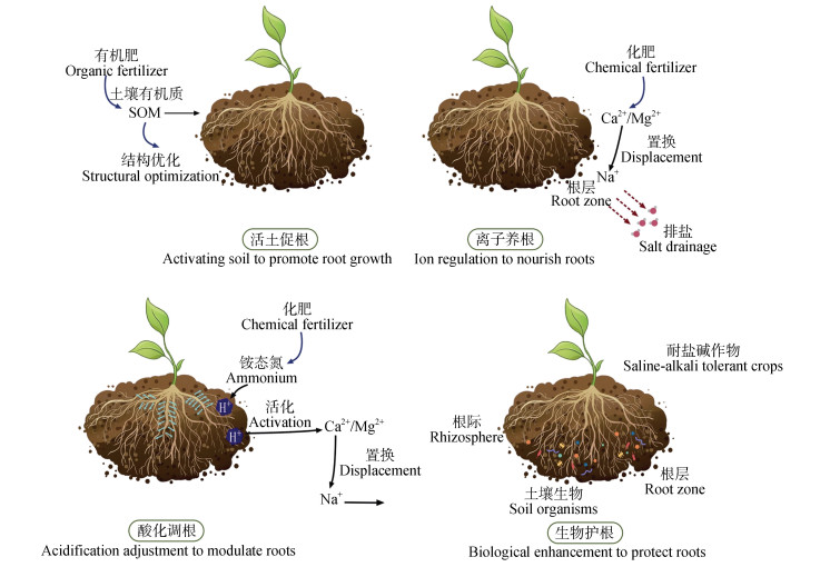 3 盐碱地作物“根际适生微域”理论和技术路径的构建与探索本文紧扣轻中度盐碱化土壤高效利用的关键科学问题,融合土壤培肥增碳降盐、养分均衡供应抑盐、物理结构优化消板及根际生物功能强化等多学科理论,创新构建“根际适生微域”理论架构。该架构从土壤-植物-微生物多层级互作机制出发,系统阐释“根际适生微域”构建原理,致力于突破作物对盐碱环境适应性的瓶颈,提出涵盖“活土促根、离子养根、酸化调根、生物护根”的学术思路与技术路径构想(图 1)。