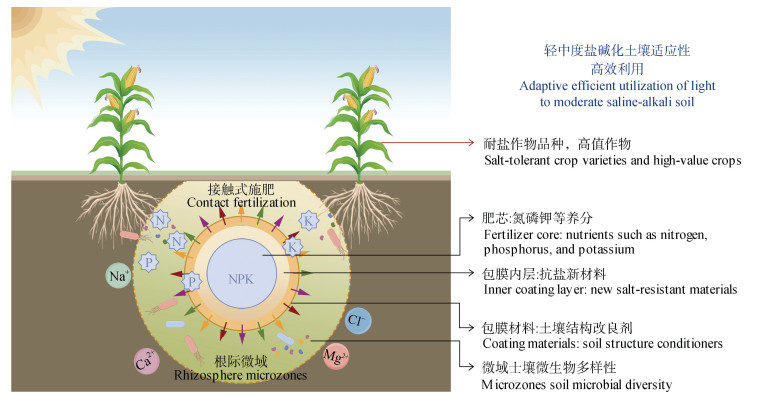 综上所述,尽管现有盐碱地治理技术种类繁多,但在实际推广应用中,能被各地广泛接纳并实现大规模应用的技术仍较为匮乏。究其根源,主要在于治理成本高昂,多数地区面临较大的财政压力,难以支撑长期技术应用。由此可见,探索与区域经济发展水平相适配的低成本改良技术已成为当务之急[59]。同时,鉴于盐碱区域多为生态脆弱与敏感地带,盐碱地治理技术及产品的研发与应用,不仅需确保显著的改良效果,更要满足安全、绿色的环保要求,切实避免对耕地资源和生态环境造成污染与破坏[56]。因此,创新盐碱地作物“根际适生微域”抗盐增效理论,构建以包膜控释肥为核心的技术体系,通过调控根际微环境,有望撬动植物-土壤系统耐盐性与养分利用效率的整体提升,实现“四两拨千斤”的改良效果。该技术路径可有效促进盐碱地粮食安全保障、资源高效利用及生态环境保护的多目标协同发展,不仅为我国盐碱地绿色开发提供新的理论与技术支撑,也为破解全球盐碱地改良发展难题提供了新思路。