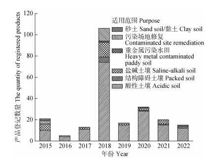 图 1 2015—2022年间农业农村部登记的土壤调理剂产品的适用范围 Fig. 1 The application of soil amendments registered by the Ministry of Agriculture and Rural Affairs of China between 2015 and 2022 |