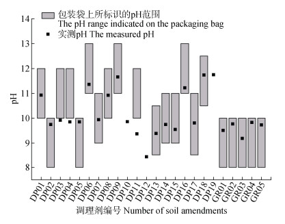 注:DP10和DP19两个产品的包装袋上未标识pH范围。 Note:The packages of products P10 and P19 do not specify a pH range. 图 3 24种商品土壤调理剂包装袋上所标识的pH范围和样品实测pH Fig. 3 The pH ranges indicated on the package of the 24 types of acidic soil amendments and the measured pH of these amendments |