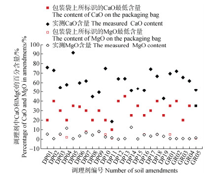 注:部分样品的包装袋上未标识最低MgO含量。 Note:Among these,the packages of some amendments do not indicate the minimum content of MgO. 图 4 24种商品土壤调理剂包装袋上所标识的最低CaO和MgO含量和样品实测的CaO和MgO含量 Fig. 4 The minimum contents of CaO and MgO indicated on the package of the 24 types of acidic soil amendments and the measured CaO and MgO contents of these amendments |