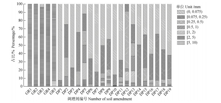在种植业管理司网站检索到的酸性土壤调理剂产品中,粉剂占比达到了65.3%,颗粒剂的占比则为34.7%。说明此类产品中以粉剂为主流,占绝大多数,其次为颗粒剂,尚不存在水剂型酸性土壤调理剂。采用筛分法测得所收集到的24种市售土壤调理剂的粒径分级如图 5所示,分析发现,5种颗粒剂的细度较为均一,绝大多数粒径落在2~5 mm区间。19种粉剂产品间的细度差异则相对较大。除DP5外,其余所有粉剂产品均有超过半数的粒径不大于0.25 mm,这印证了粉剂以粉末为主要产品形态,较小的粒度可提高调理剂与土壤接触的表面积,加快反应进程。值得注意的是,有一些产品,筛分得到的不同细度组分展现出明显不同的形态外观。结合相关资料可知,这是由于此类产品使用了不同组分粉碎后混合复配的工艺,不同组分粉碎的细度不一致。需要注意的是,肥料及调理剂产品的形态对其商业推广的影响极大。目前酸性土壤调理剂主要以粉剂为主,部分调理剂形似“水泥”粉末,种植户施用时扬尘极大,防护不当易进入口鼻,危害人体健康,不利于产品推广。
