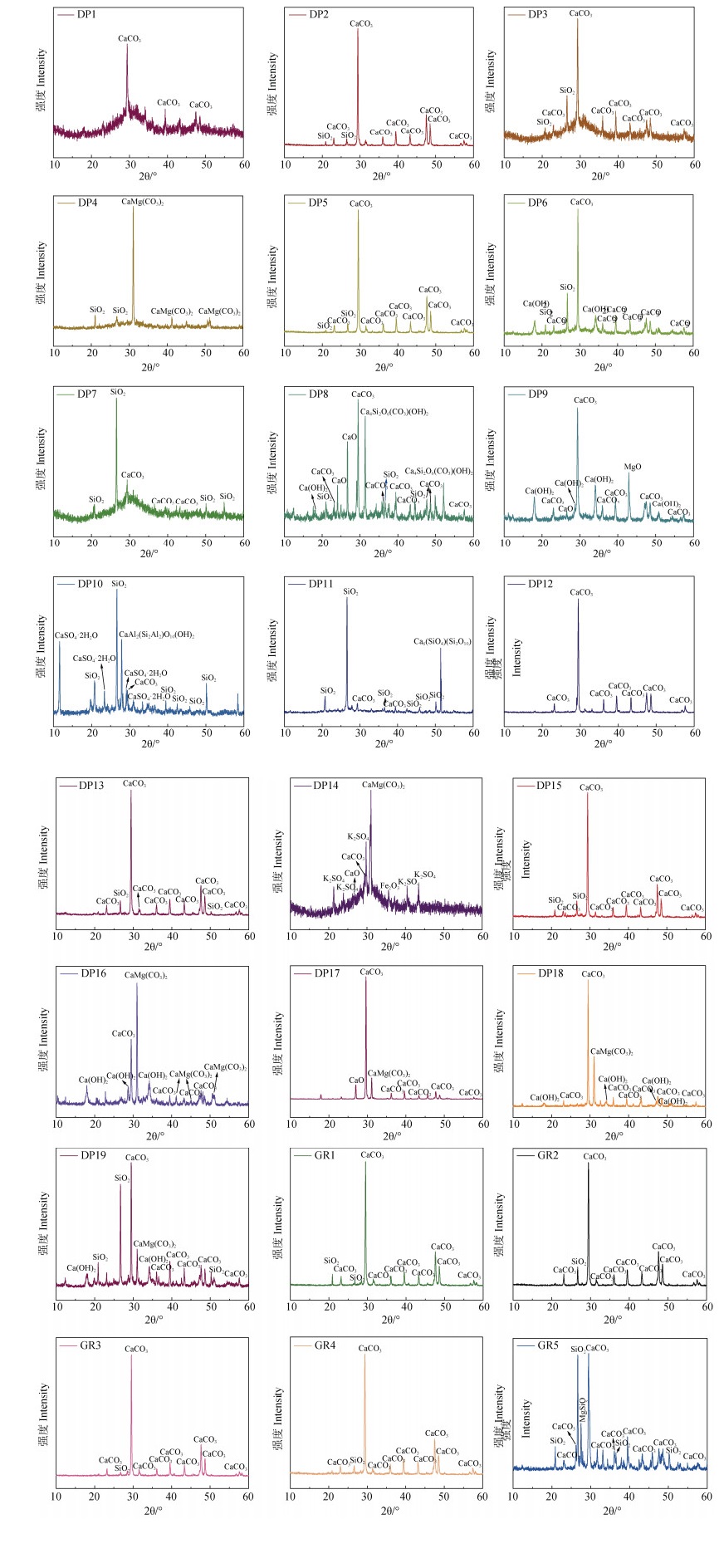 2.4 商品调理剂的化学本质特征本研究中供试的24种商品土壤调理剂的XRD图谱如图 6所示,其中有2个样品仅显示出1种物相,13个样品显示出2种物相,4个样品显示出3种物相,5个样品显示4种及以上的物相,说明目前市售商品调理剂的成分是比较单一的。供试的24种市售调理剂中均检出方解石主要成分CaCO3的X射线衍射峰,另外在DP6、DP8、DP9、DP16、DP18、DP19共6种产品检测出熟石灰Ca(OH)2,在DP8、DP9、DP14、DP17存在生石灰CaO,在DP4、DP14、DP16、DP17和DP19中检索出白云石的主要成分CaMg(CO3)2,在DP9中检测出MgO。这些钙镁的氧化物、氢氧化物及碳酸盐是可直接中和土壤酸度的碱性物质,也可及时补充酸性土壤所缺乏的钙镁盐基离子。此外,这些物质廉价易得,可通过直接采集或进一步煅烧石灰岩、白云岩或牡蛎壳等富含碳酸盐的岩石矿物或农副产品加工制得。所以无论商品土壤调理剂的原材料和加工工艺如何,对土壤调酸起直接作用的是钙镁的(氢)氧化物及碳酸盐,其中以含钙物质的使用最为广泛。除含有调酸物质外,部分商品土壤调理剂还在包装袋上标识了含有少量氮、钾以及其他中微量养分元素。如在DP14中检索出K2SO4的衍射峰,说明该产品还富含钾素。这也说明了土壤的调酸和培肥是密不可分的,在酸性土壤调理剂中如果添加一些养分元素,使产品兼具调酸和培肥的效果,种植户施用后对作物生长的促进作用更好,更有利于酸性土壤调理剂的市场推广。此外,绝大部分调理剂中均含有硅元素,15种市售调理剂产品中的含硅物质主要以SiO2的形态存在,少量产品的含硅物质以硅酸盐形态存在。硅对部分作物而言是有益元素,对水稻等禾本科作物更是必需元素,但是以SiO2形态存在的硅是无法被植物吸收利用的,土壤调理剂中添加的SiO2对植物生长无促进作用。