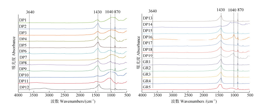 从红外光谱图中可见(图 7),DP6、DP8、DP9、DP16、DB18和DP19在波数3624 cm–1左右出现峰值,该峰代表羟基(OH)的伸缩振动[16]。这一结果与该6种调理剂的矿物组成均含有Ca(OH)2的结果相吻合,调理剂中Ca(OH)2中的-OH使红外光谱图具有一定的吸收峰。在1430 cm–1左右,除DP7、DP10、DP11和DP14四种调理剂的峰值较弱外,其余产品的吸收峰均特别明显。此外,除P7、DP10、DP11和DP14外,其余调理剂产品在870 cm–1有尖锐的吸收峰。该两处波数的峰分别为碳酸盐(CO2– 3)的伸缩振动吸收峰[17]和弯曲振动吸收峰[18],进一步说明了土壤调理剂中均有碳酸盐的存在。DP7、DP10、DP11和DP14四种调理剂的XRD图谱中CaCO3的衍射峰较弱,这也恰好和这些产品较低的红外吸收峰对应,波数1410 cm–1处的红外吸收峰再次验证了来自矿物或生物源的碳酸盐是酸性土壤调理剂的常用原料。此外,绝大多数调理剂产品在1040 cm–1处存在不同强弱程度的吸收峰,该峰为Si-O键的伸缩振动,说明调理剂产品中含有SiO2或硅酸盐矿物。结合市售商品土壤调理剂的原料特征和加工工艺,土壤调理剂的红外光谱结果进一步佐证了其主要成分包含氢氧化物、碳酸盐、硅酸盐和二氧化硅。