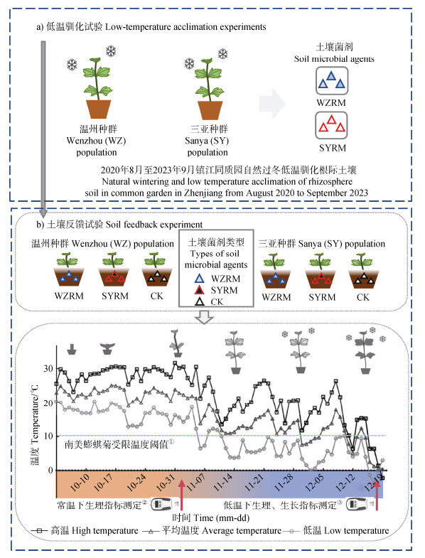1.2 试验设计试验分为2阶段,低温驯化试验在镇江种植温州和三亚两个南美蟛蜞菊种群,并自然过冬、低温驯化三年(图 1a)和土壤反馈试验(图 1b),具体如下: