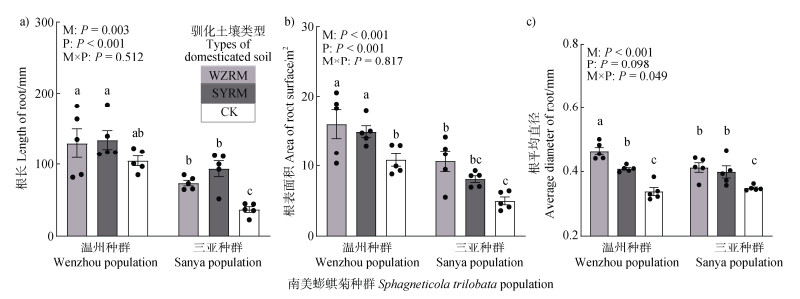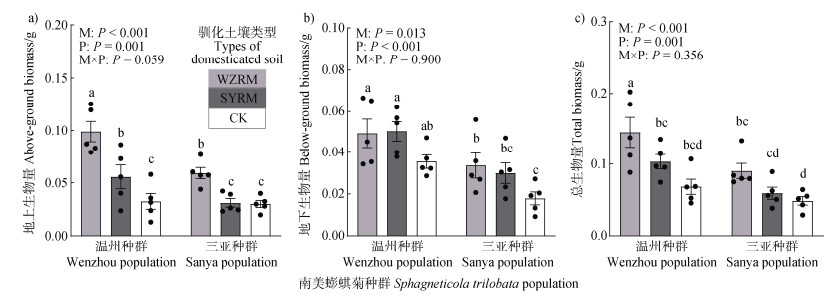 注:不同字母表示不同处理间的差异显著(均值±标准误,n=5,P < 0.05)。M,菌剂;P,种群;M ×P,菌剂×种群。下同。 Note: Different letters indicated significant differences between different treatments(mean ± SE, n = 5, P < 0.05). M, Microbial agent; P, Population; M ×P, Microbial agent × population. The same below. 图 2 不同菌剂处理对南(三亚)北(温州)种群来源南美蟛蜞菊植株生物量的影响(a. 地上生物量,b. 地下生物量,c. 总生物量) Fig. 2 The effects of different microbial agents on the biomass of Sphagneticola trilobata from Southern(Sanya)and Northern(Wenzhou)populations(a. Above-ground biomass, b. Below-ground biomass, and c. Total biomass) |