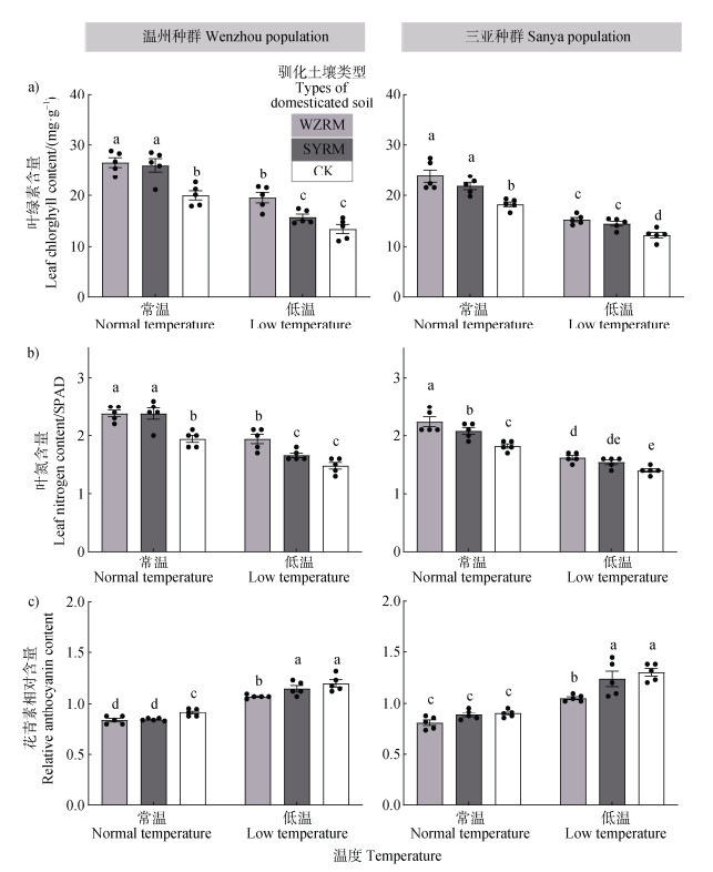 在常温(15.6 ℃~27.3 ℃)情况下,两种来源根际土壤菌剂均显著提高了植物体内叶绿素含量和叶片氮含量、显著降低花青素相对含量(图 4,表 1,P < 0.001)。随着温度降低,各种群南美蟛蜞菊的叶绿素和叶片氮含量逐渐降低、花青素相对含量逐渐升高,并且三亚种群根际土壤微生物菌剂的作用变得不显著,但温州种群根际土壤微生物菌剂对植物的作用仍然显著(图 4)。低温处理下(4.9 ℃~14.9 ℃)不加驯化根际土壤菌剂时,温州种群叶绿素含量(图 4a)和叶片氮含量(图 4b)显著高于三亚种群,花青素相对含量(图 4c)显著低于三亚种群。