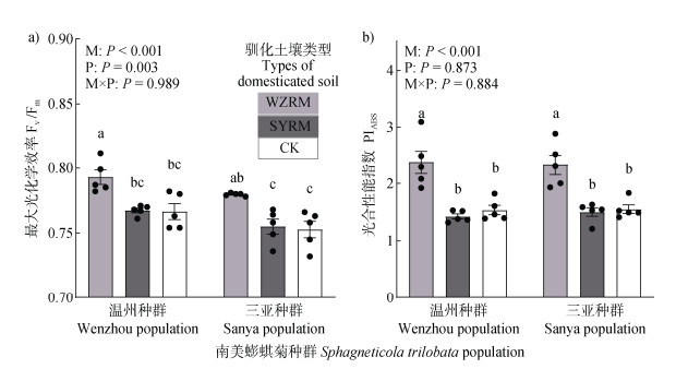 1.2.2 土壤反馈试验土壤反馈试验阶段共设置6个处理组,新种植温州、三亚两个种群植物植株分别接种WZRM菌剂、SYRM菌剂以及不接种菌剂的阴性对照组(CK)(图 1b),每个处理设置5个重复。