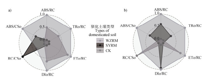 接种温州种群根际土壤微生物菌剂的南北不同种群来源的南美蟛蜞菊叶片单位面积吸收的光能(ABS/CSo)和4个代表单位反应中心性能的参数(反应中心吸收光能ABS/RC、PSⅡ的最大捕获量TRo/RC、用于电子传递的能量ETo/RC、单位反应中心的热耗散DIo/RC)均高于接种三亚种群根际土壤微生物菌剂和对照组(图 6)。