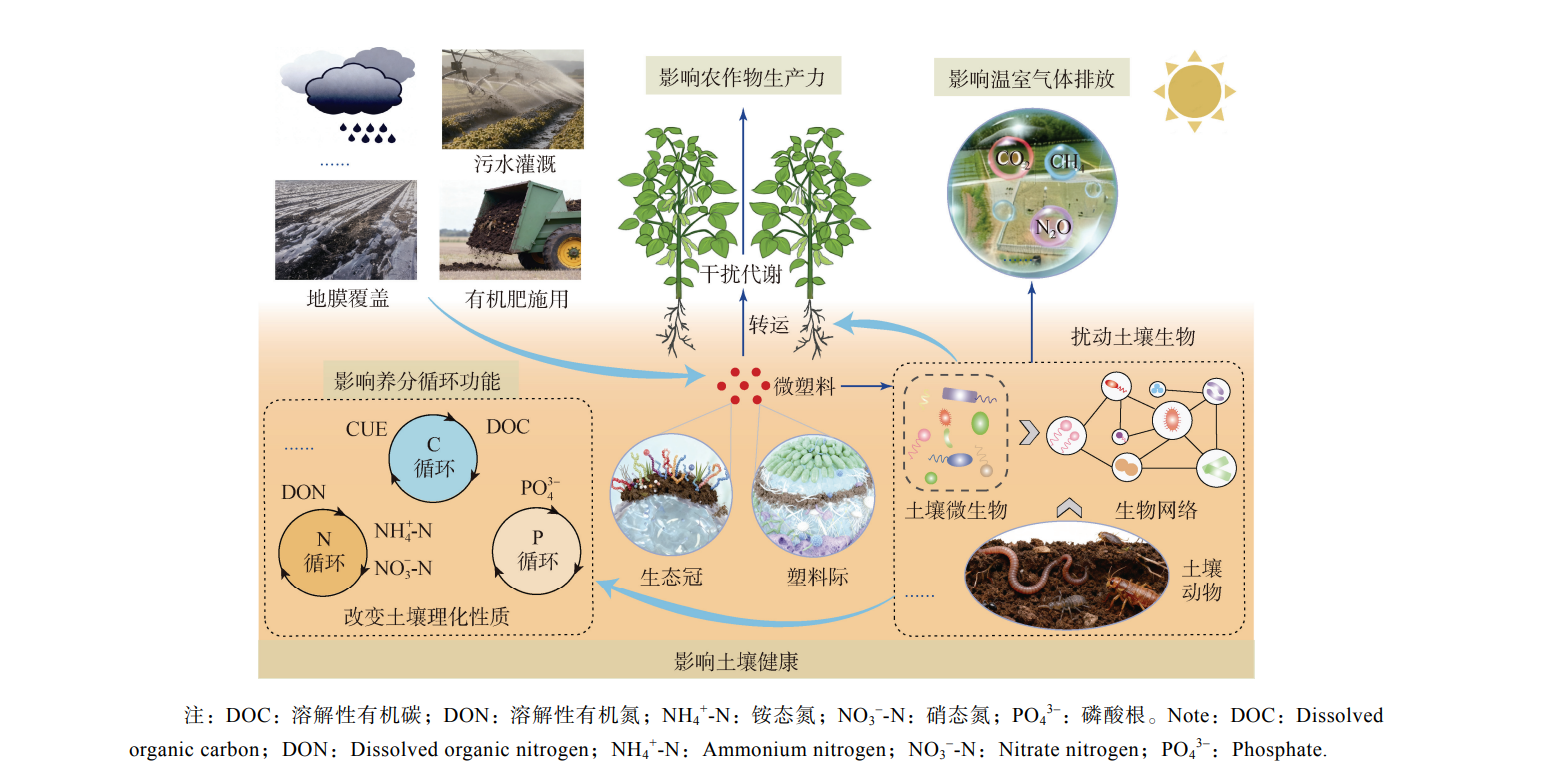 Microplastics have emerged as a widespread pollutant in agricultural soils, entering primarily through plastic film mulching, sewage irrigation, and the application of organic fertilizers. Their continuous accumulation poses a growing threat to soil ecosystem health and functionality. Therefore, a deep understanding of the impact process and mechanism of microplastics on the functioning of agricultural soil ecosystems is of great scientific significance and practical value for scientifically assessing their ecological and environmental risks, developing pollution control and remediation strategies. This review systematically examines the migration and transformation behavior of microplastics in agricultural soil and analyzes their diverse ecological effects, including alterations to soil physicochemical properties, shifts in microbial communities, impacts on soil fauna, and influence on crop growth. It also synthesizes current knowledge regarding the broader implications of microplastics on soil nutrient cycling, greenhouse gas emissions, crop productivity, and overall soil health. On this basis, key scientific questions are identified in areas such as the complex environmental behavior mechanisms of microplastics in real environments, inter-trophic interactive effects, and the systematic assessment of ecological risks and soil health. Finally, future research priorities and directions are proposed to provide a theoretical foundation for risk prevention and green remediation of microplastic pollution in agricultural soils.