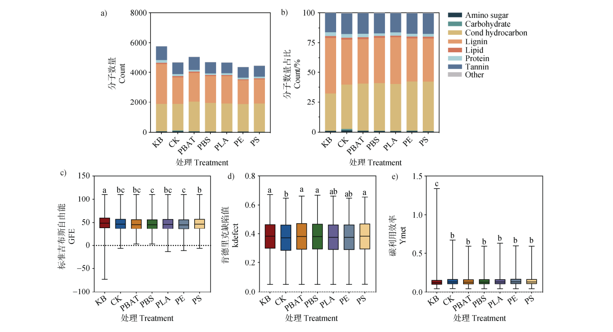 【Objective】Soil serves as a significant sink for microplastics (MPs), with the annual influx of MPs into soil being 4 to 23 times greater than that entering the ocean. Therefore, the assessment of the potential environmental effects of soil MPs cannot be ignored. As a non-natural carbon source, the precise impact of MPs on dissolved organic matter (DOM) in soil-crop systems remains unclear. 【Method】This study investigated the behavior of conventional MPs (polyethylene, PE; polystyrene, PS) and biodegradable MPs (polybutylene adipate terephthalate, PBAT; polybutylene succinate, PBS; polylactic acid, PLA) in soil using maize-cultivated pot experiments. We measured dissolved organic carbon (DOC) concentration, DOM fluorescence characteristics, and DOM molecular composition and properties in the system after MPs addition. 【Result】The results showed that MPs increased soil DOC content, as well as the humification degree and stability of DOM. Simultaneously, MPs decreased the H/C ratio of DOM molecules and the relative content of amino acid, carbohydrate, and protein-like molecules in the soil-plant system, while increasing the aromaticity index (AI) and nominal oxidation state of carbon (NOSC) values. 【Conclusion】Overall, this study reveals the impact of different types of MPs on DOM components in soil-crop systems, providing an important theoretical basis for the comprehensive assessment of the environmental risks of MPs and the formulation of plastic control policies.